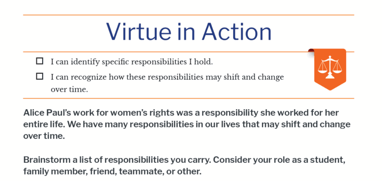 Alice Paul’s work for women’s rights was a responsibility she worked for her entire life. We have many responsibilities in our lives that may shift and change over time.
