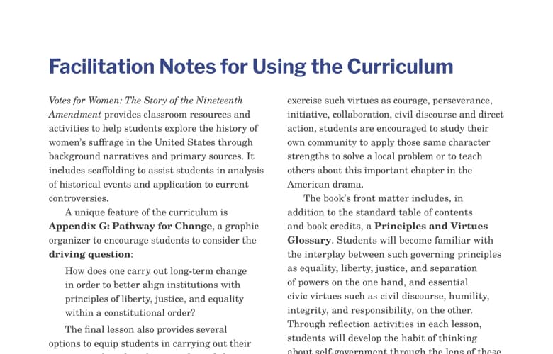 The final lesson also provides several options to equip students in carrying out their own project-based application of social change to address a community challenge. Having analyzed the history of women’s suffrage as an example of what can be achieved when people exercise such virtues as courage, perseverance, initiative, collaboration, civil discourse and direct action, students are encouraged to study their own community to apply those same character strengths to solve a local problem or to teach others about this important chapter in the American drama.