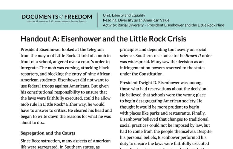 President Eisenhower looked at the telegram from the mayor of Little Rock. It told of a mob in front of a school, angered over a court’s order to integrate. The mob was cursing, attacking black reporters, and blocking the entry of nine African American students. Eisenhower did not want to use federal troops against Americans. But given his constitutional responsibility to ensure that the laws were faithfully executed, could he allow mob rule in Little Rock? Either way, he would have to answer to critics. He cleared his head and began to write down the reasons for what he was about to do…