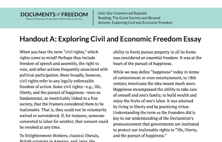 While we may define “happiness” today in terms of contentment or even entertainment, to 18th century Americans the idea meant much more. Happiness encompassed the ability to take care of oneself and one’s family, to build wealth and enjoy the fruits of one’s labor. It was attained by living in liberty and by practicing virtue. Understanding the term as the Founders did is key to our understanding of the Declaration’s pronouncement that governments are instituted to protect our inalienable rights to “life, liberty, and the pursuit of happiness.”