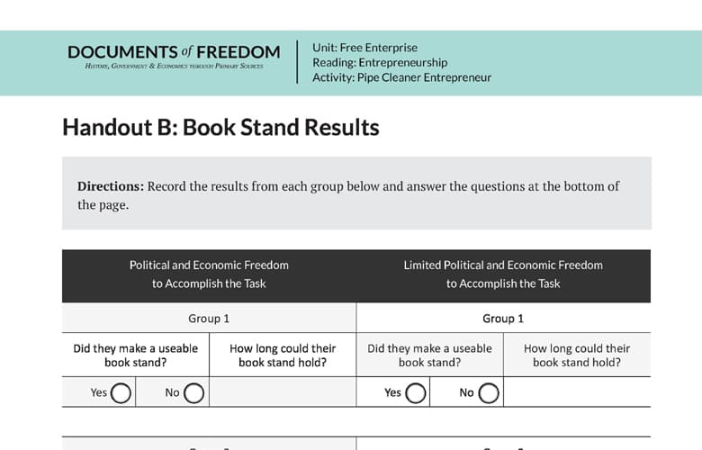 - What were some of the characteristics of the “Political and Economic Freedom” teams? How did the group decide to build the book stand? Who were the leaders? What slowed the group down or sped the group up?