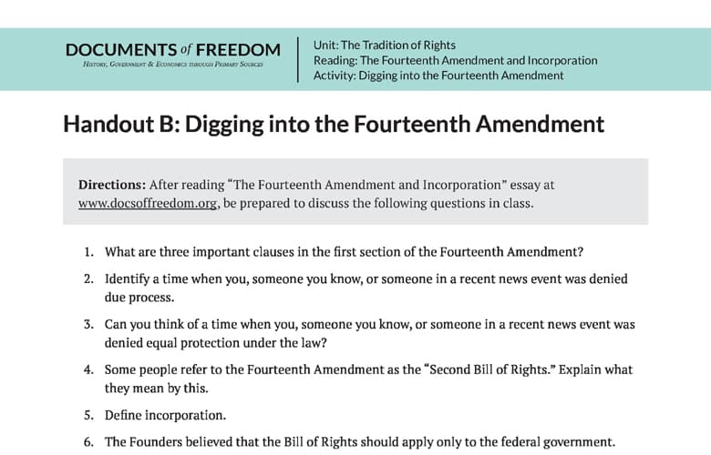 Directions: After reading “The Fourteenth Amendment and Incorporation” essay, be prepared to discuss the following questions in class.