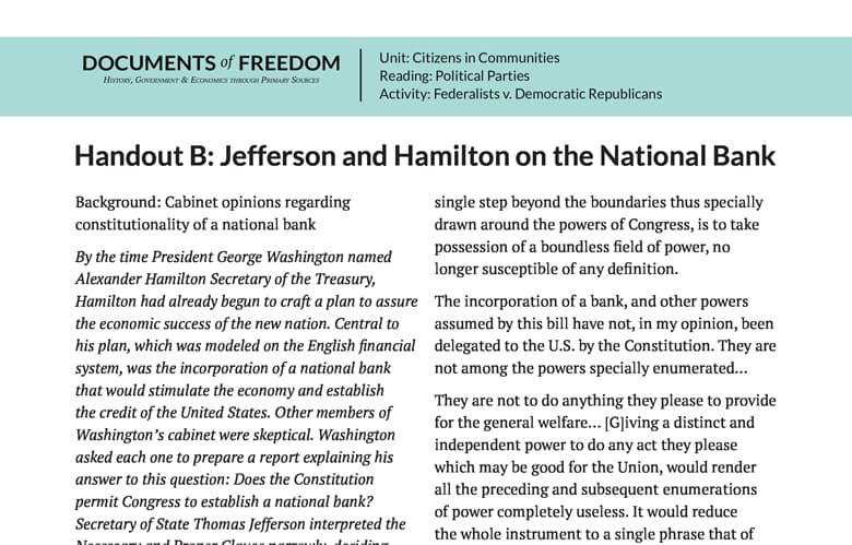 By the time President George Washington named Alexander Hamilton Secretary of the Treasury, Hamilton had already begun to craft a plan to assure the economic success of the new nation. Central to his plan, which was modeled on the English financial system, was the incorporation of a national bank that would stimulate the economy and establish the credit of the United States. Other members of Washington’s cabinet were skeptical. Washington asked each one to prepare a report explaining his answer to this question: Does the Constitution permit Congress to establish a national bank? Secretary of State Thomas Jefferson interpreted the Necessary and Proper Clause narrowly, deciding that the bank was unconstitutional because it was not specifically included in the enumerated powers of Congress. Hamilton built his defense of the bank on the implied powers of the Necessary and Proper Clause. Hamilton’s argument was more persuasive to Washington and he signed the Bank Bill. These approaches to understanding the powers of the national government set the foundation for analysis of the constitutional limits on national power continuing into the present day. They also marked the beginning of two political parties.