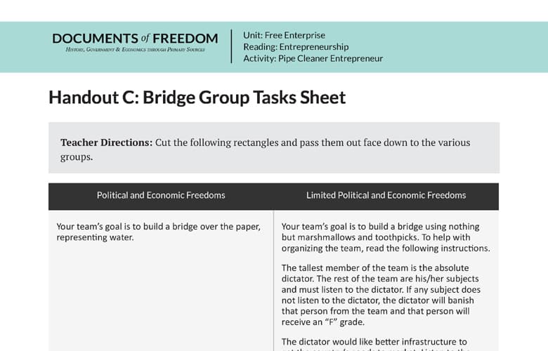 The tallest member of the team is the absolute dictator. The rest of the team are his/her subjects and must listen to the dictator. If any subject does not listen to the dictator, the dictator will banish that person from the team and that person will receive an “F” grade. The dictator would like better infrastructure to get the country’s goods to market. Listen to the dictators instructions on how to accomplish making the bridge.  |