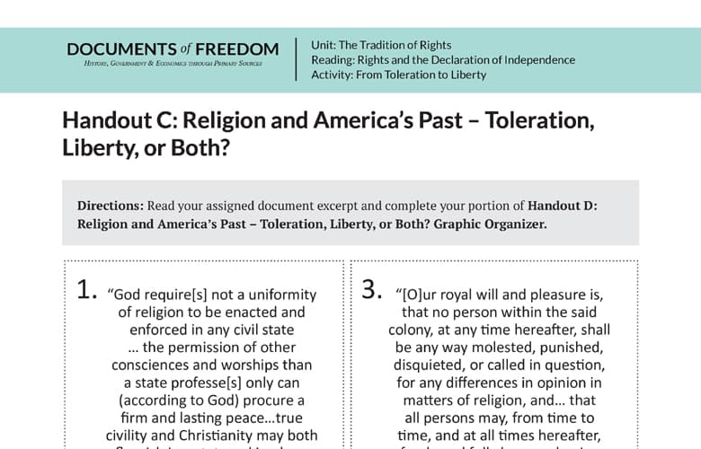 Directions: Read your assigned document excerpt and complete your portion of Handout D: Religion and America’s Past – Toleration, Liberty, or Both? Graphic Organizer.