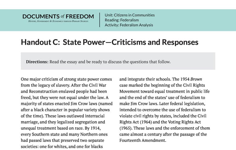 Others disagreed, pointing out that national governments have no better record of protecting rights than states do. The federal government did not effectively protect citizens’ rights during centuries of slavery and segregation. If more power were given to the federal government in the name of protecting rights, what would happen if officials then used that greater power to do bad things that affected the whole nation?