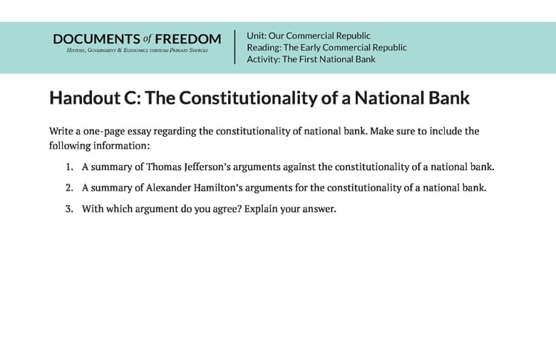 - A summary of Thomas Jefferson’s arguments against the constitutionality of a national bank.