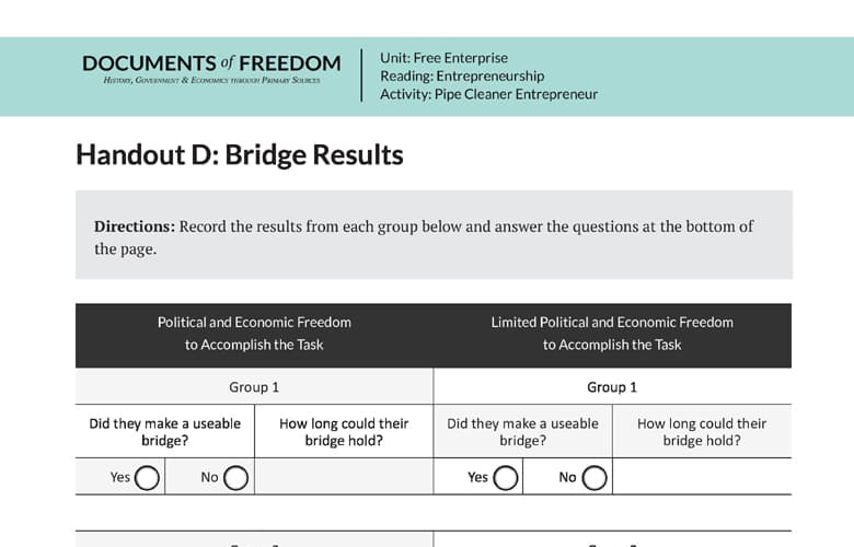- What were some of the characteristics of the “Political and Economic Freedom” teams? How did the group decide to build the bridge? Who were the leaders? What slowed the group down or sped the group up?