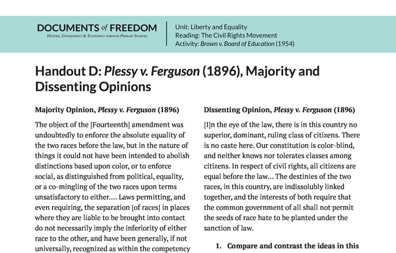 Handout D: Plessy v. Ferguson (1896), Majority and Dissenting Opinions