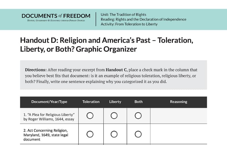 Handout D: Religion and America’s Past Toleration, Liberty, or Both? Graphic Organizer