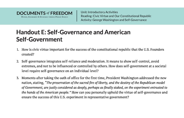 - Moments after taking the oath of office for the first time, President Washington addressed the new nation, stating, “The preservation of the sacred fire of liberty, and the destiny of the Republican model of Government, are justly considered as deeply, perhaps as finally staked, on the experiment entrusted to the hands of the American people.” How can you personally uphold the virtue of self-governance and ensure the success of this U.S. experiment in representative government?
