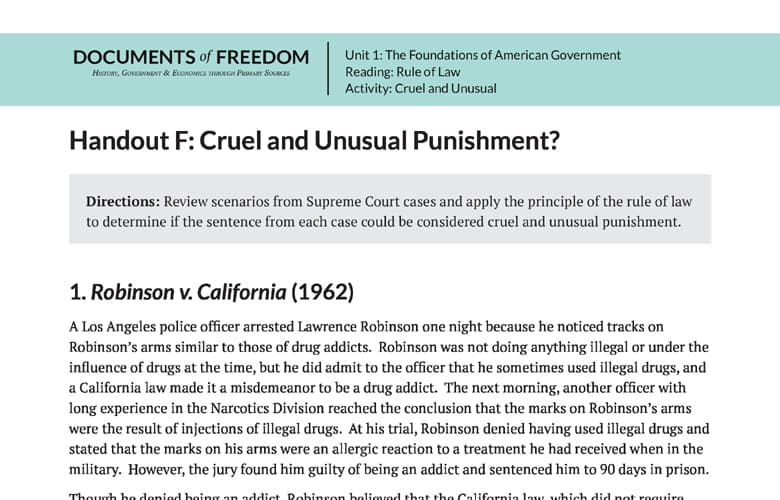 Directions: Review scenarios from Supreme Court cases and apply the principle of the rule of law to determine if the sentence from each case could be considered cruel and unusual punishment.