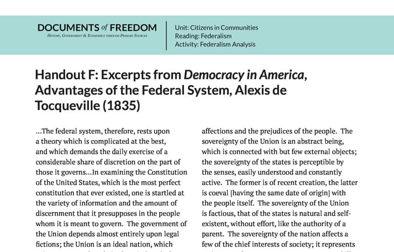 Handout F: Excerpts from Democracy in America, Advantages of the Federal System, Alexis de Tocqueville (1835)