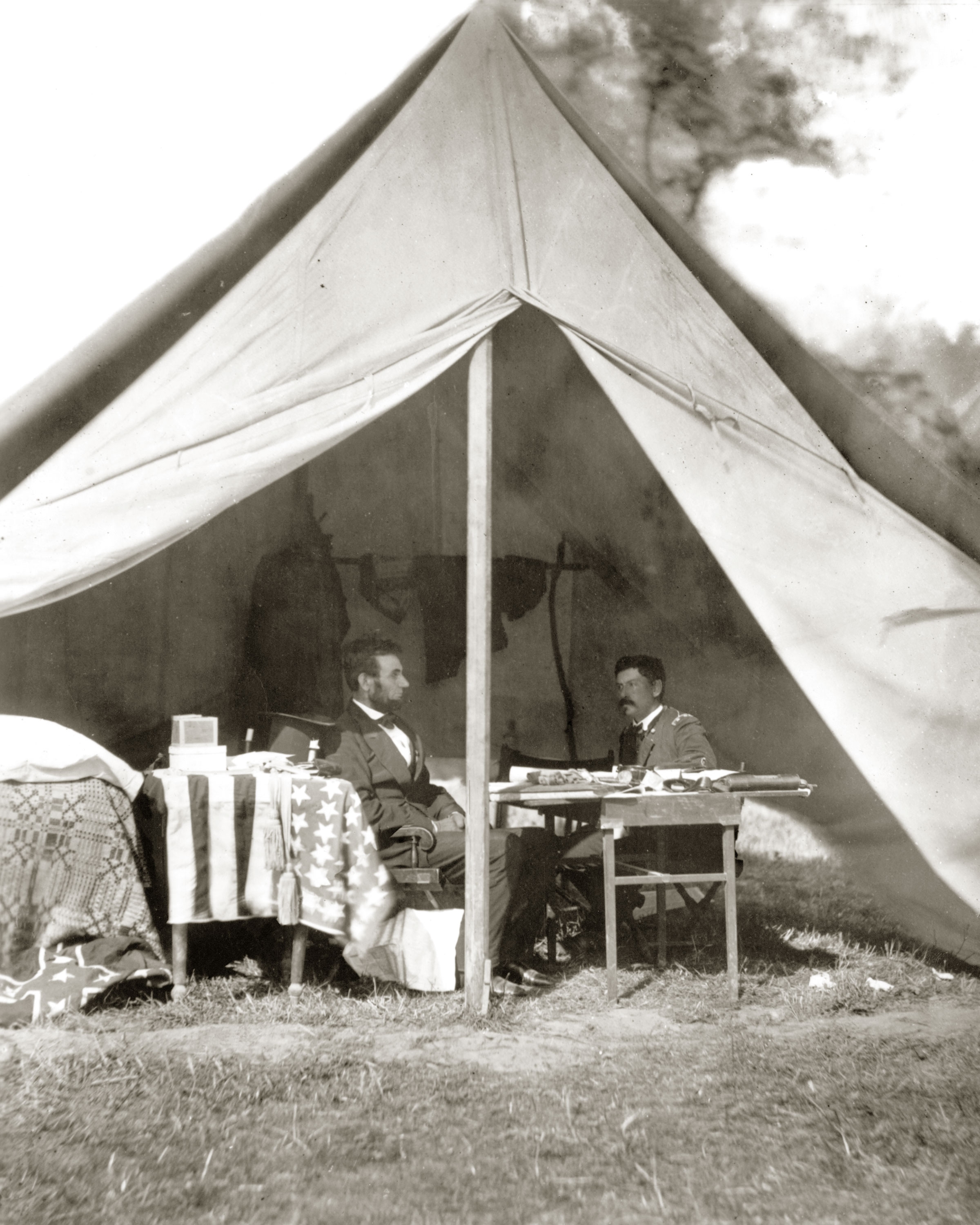 Photo 2. Alexander Gardner captured this image of General McClellan and President Lincoln at McClellan’s headquarters on October 4, 1862. Note the American flag on the table behind Lincoln and the captured Confederate battle flag on the ground.