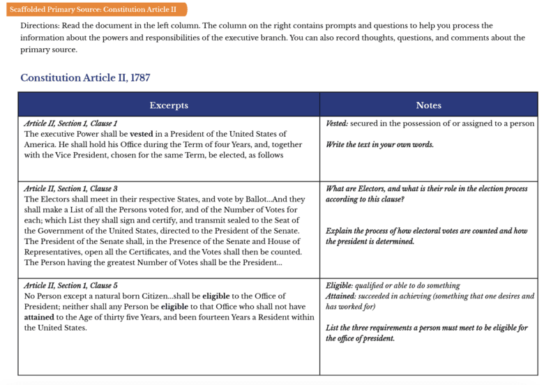 A scaffolded version of Article II of the U.S. Constitution with key terms defined and comprehension questions.