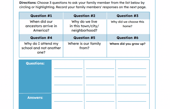 A homework assignment where students interview a family member to learn more about how their family arrived at their current place.