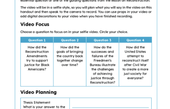 An assessment activity that asks students to create a video that answers one of the guiding questions from the lessons.