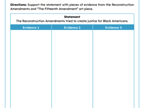 An activity to accompany the Reconstruction Amendments and the primary source image that asks students to support the claim that the Reconstruction Amendments tried to create justice for Black Americans.
