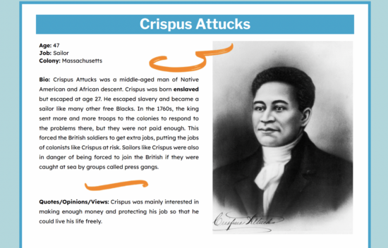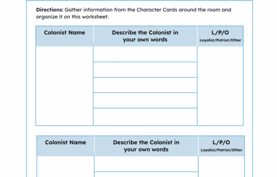 Handout to be used with Colonists Character cards that introduce students to important historical figures.