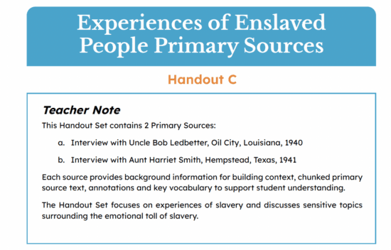 A primary source set that focuses on experiences of slavery and discusses sensitive topics surrounding the emotional toll of slavery.