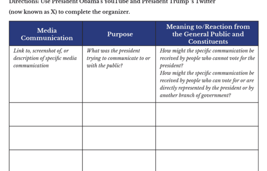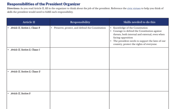 An activity in which students define the roles of the president and explain the skills and traits required to fulfill these roles.