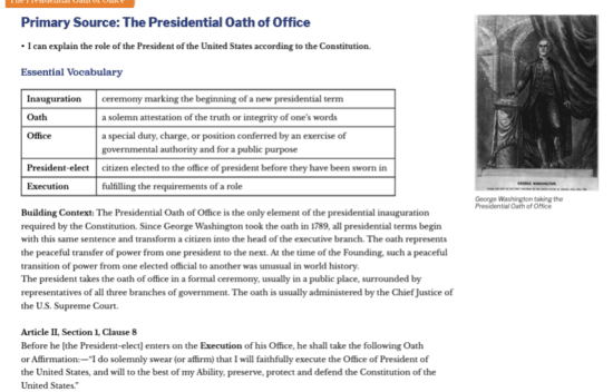 The text of Article II, Section 1, Clause 8 that contains the Presidential Oath of Office and corresponding comprehension questions.
