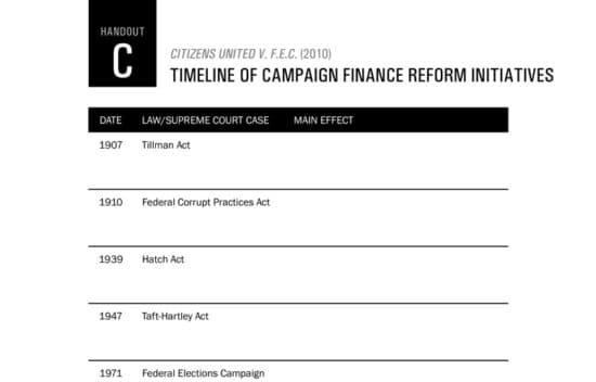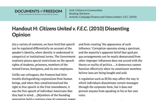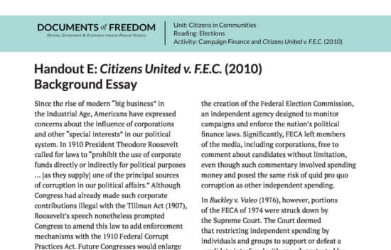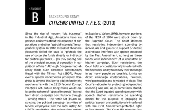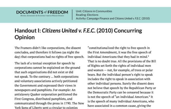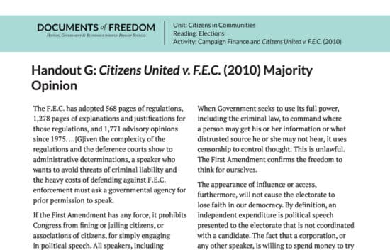 Case background and primary source documents concerning the Supreme Court case of Citizens United v. F.E.C. Dealing with free speech in the political arena, this lesson asks students to asses whether or not the Supreme Court ruled correctly in Citizens United in light of constitutional principles including republican government, freedom of speech, and property rights.