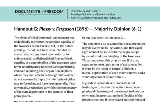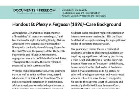 Case background and primary documents concerning Plessy v. Ferguson. Dealing with the principle of Equal Protection, this lesson asks students to evaluate the degree to which custom, precedent, and understanding of federalism informed the ruling in the case.