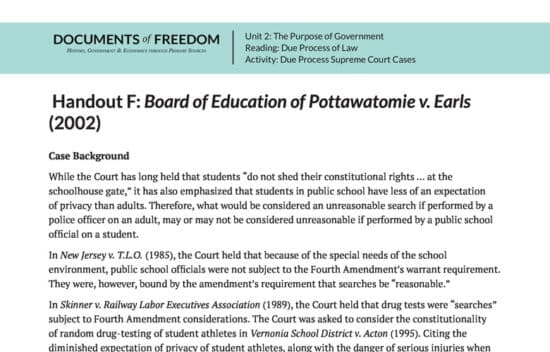 Case background and primary source documents concerning the Supreme Court case of Pottawatomie v. Earls. Dealing with students' Fourth Amendment protections when in schools, this lesson asks students to assess the Court's evolving definition of "reasonable" searches with respect to public school students.