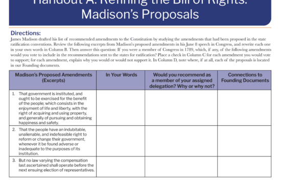 A graphic organizer to help students analyze the proposed Bill of Rights and connect them to the themes of other Founding Documents.