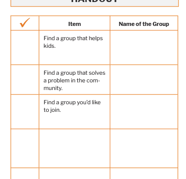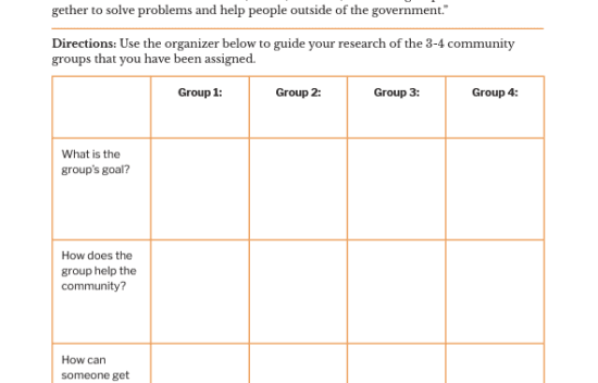 A handout for student Investigation into local civic groups to identify how they work to solve local problems.
