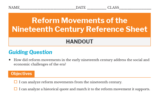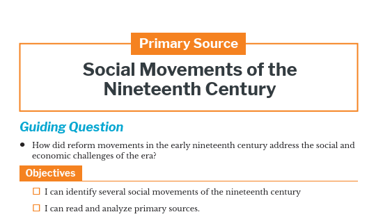 Help students sort primary sources into categories to illustrate understanding of nineteenth century social movements.