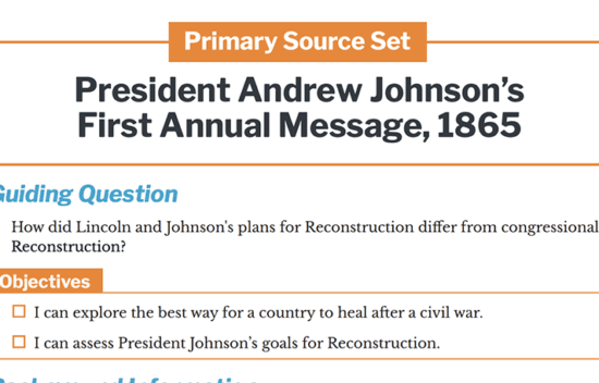 The text of this speech with terms defined and reflection questions to guide an understanding of President Andrew Johnson's goals for Reconstruction.
