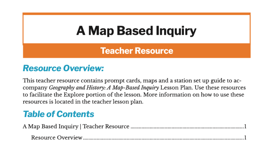 This teacher resource contains prompt cards, maps and a station set up guide to accompany Geography and History: A Map-Based Inquiry Lesson Plan. Use these resources to facilitate the Explore portion of the lesson. More information on how to use these resources is located in the teacher lesson plan.