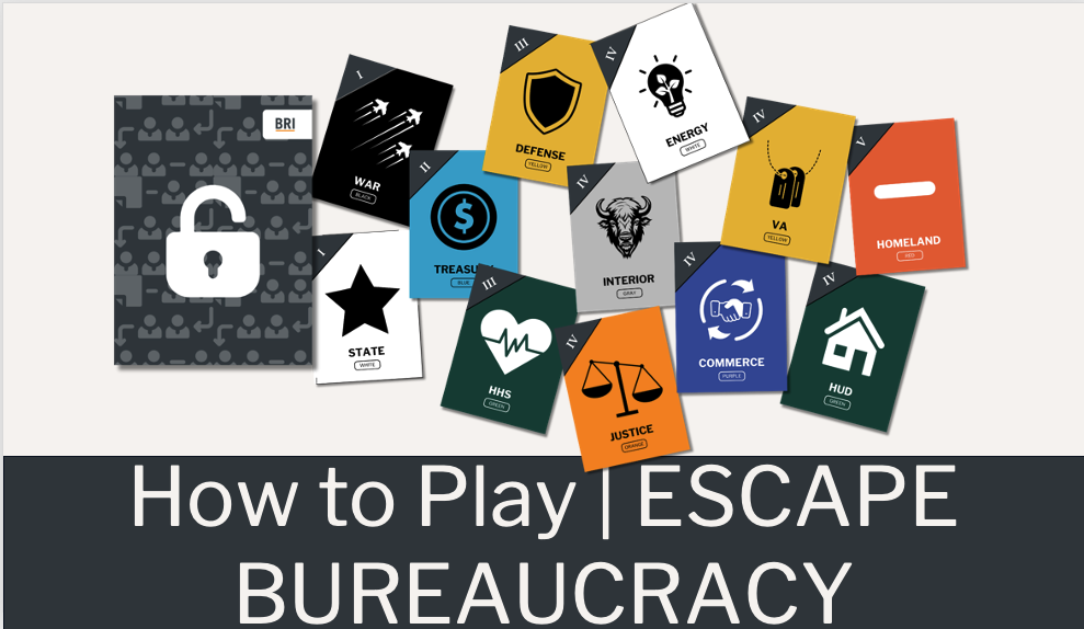 ActivityEscape Bureaucracy Card GameA collaborative organization challenge that highlights the pros and cons of bureaucracy while introducing the cabinets of the Executive Office.