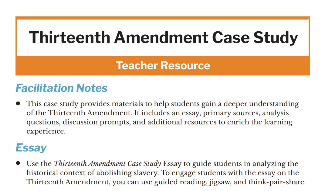 - This case study provides materials to help students gain a deeper understanding of the Thirteenth Amendment. It includes an essay, primary sources, analysis questions, discussion prompts, and additional resources to enrich the learning experience.