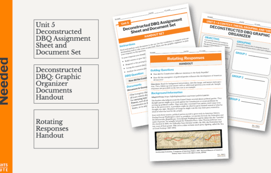 Page:Resources LibraryArrow iconCurriculum:Building a Self-Governing People: Civics & US History for Middle SchoolArrow iconUnit:Unit 5: Early Republic (1789-1815)Arrow iconLesson:Unit 5: Early Republic Deconstructed DBQUnit 5: Context, Thesis, Grouping Sources, and Document Analysis Slide Deck