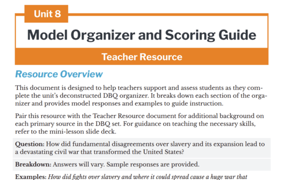 This document provides teacher support for implementing the Unit 8: Civil War Deconstructed DBQ in the middle school classroom. It includes seven documents, each designed to help students explore connections to the DBQ question while understanding the relevant historical context.