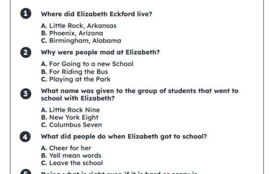 Activity(2-3) Digital Mini-book Option B – Eckford’s Epic CourageMini-Book. Grades 2-3, Civil Rights, Courage.A more detailed mini-book with richer vocabulary and historical context showing how Eckford's brave actions helped desegregate Little Rock Central High.