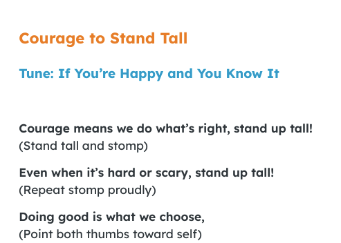 Activity(K-3) Courage Song – Eckford’s Epic CourageSong. Courage, Vocabulary, Joyful Learning. A classroom-friendly song that introduces courage through Elizabeth Eckford's story. Simple motions and repeated vocabulary help students understand what courage looks and feels like.