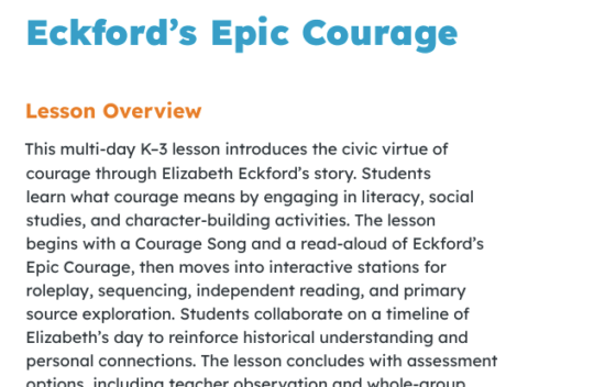 Page:Resources LibraryArrow iconCurriculum:ElementaryEckford’s Epic CourageIcon based on badge text3 LessonsIcon based on badge text11 ActivitiesLessonsLesson(K-3) Week-long Lesson Plan – Eckford’s Epic CourageLesson Plan. Courage, Civil Rights, Desegregation. A multi-day lesson where students learn about courage through Eckford's story through reading, stations, role play, sequencing, and primary sources.Lesson(K-3) Mini-Lesson Reading Skill – Sequencing Eckford’s StoryMini-Lesson. Reading Comprehension, Sequencing, Courage. Students read Eckford's story, sing a courage song, and sequence events to build comprehension and historical understanding.Lesson(K-3) Social Studies Skill Mini-Lesson – Multiple Perspectives and Eckford’s Epic CourageMini-Lesson. Multiple Perspectives, Civil Rights, Social Studies Skills. Students read a mini-book, sing a Courage Song, and write or draw from another person's point of view to practice perspective-taking.ActivitiesPrevious slideNext slideActivity(K-3) Courage Song – Eckford’s Epic CourageSong. Courage, Vocabulary, Joyful Learning. A classroom-friendly song that introduces courage through Elizabeth Eckford's story. Simple motions and repeated vocabulary help students understand what courage looks and feels like.Activity(K-3) Coloring Sheet – Eckford’s Epic CourageColoring Page. Creativity, Vocabulary, Visual Reinforcement. A calming coloring sheet featuring Eckford and courage vocabulary.Activity(K-3) Sequencing Cut and Paste Handout – Eckford’s Epic CourageStudent Handout. Sequencing, Fine-Motor Practice, Story Understanding. Students cut and sequence key moments from Eckford's story to understand how her courageous day unfolded.Activity(K-3) Courage Shoes – Eckford’s Epic CourageCraft and Reflection. Empathy, Perspective-Taking, Courage. Students design "courage shoes" to imagine what it felt like to walk in Eckford's footsteps and reflect on courage in their own lives.Activity(K-3) Paper Dice Handout – Eckford’s Epic CourageStudent Handout. Discussion Prompts, Courage, Reflection. An optional build-your-own paper dice activity with simple prompts about courage and Eckford's story for partner talk or quick review.Activity(K-3) Stations Instructions and Task Cards – Eckford’s Epic CourageStations. Hands-On Learning, Eckford, Skill Practice. Station cards guide students through sorting, primary source observation, reflection, and simple role play connected to Eckford's experience.Activity(K-1) Mini-book Option A – Eckford’s Epic CourageMini-Book. Early Readers, Courage, Eckford. A K-1 mini-book with simple sentences and clear illustrations that introduces Elizabeth Eckford's story and the meaning of courage.Activity(2-3) Digital Mini-book Option B – Eckford’s Epic CourageMini-Book. Grades 2-3, Civil Rights, Courage.A more detailed mini-book with richer vocabulary and historical context showing how Eckford's brave actions helped desegregate Little Rock Central High.Activity(2-3) Printable Mini-book Option B – Eckford’s Epic CourageMini-Book. Grades 2-3, Civil Rights, Courage. Use this version if you are printing mini-books for student use. A more detailed mini-book with richer vocabulary and historical context showing how Eckford's brave actions helped desegregate Little Rock Central High.Activity(K-1) Group Assessment Option 1 – Eckford’s Epic CourageAssessment. K-1, Understanding Courage and Elizabeth Eckford. A whole-group assessment using visuals and teacher read?aloud prompts to assist teachers in checking students' understanding of courage.Activity(2-3) Group Assessment Option 2 – Eckford’s Epic CourageAssessment. Grades 2-3, Understanding Courage and Elizabeth Eckford. A short 10-question quiz that helps teachers measure students' understanding of Eckford's courageous actions and key vocabulary.Educator ResourcesEducator Resource(K-3) Teacher Observation Recording SheetsAssessment Tool. Observation, Assessment Indicators, Easy Tracking. Simple checklists help teachers record student participation, understanding, and collaboration during lessons and stations.