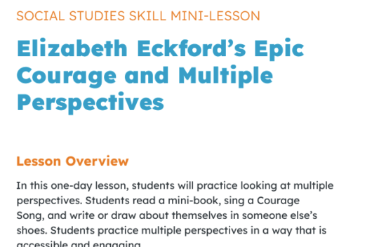Lesson(K-3) Social Studies Skill Mini-Lesson – Multiple Perspectives and Eckford’s Epic CourageMini-Lesson. Multiple Perspectives, Civil Rights, Social Studies Skills. Students read a mini-book, sing a Courage Song, and write or draw from another person's point of view to practice perspective-taking.