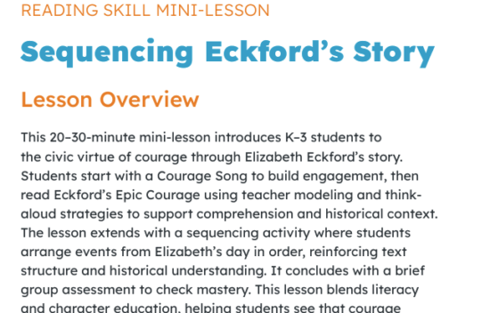 Lesson(K-3) Mini-Lesson Reading Skill – Sequencing Eckford’s StoryMini-Lesson. Reading Comprehension, Sequencing, Courage. Students read Eckford's story, sing a courage song, and sequence events to build comprehension and historical understanding.