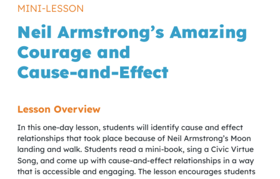 Bring Armstrong’s Amazing Courage into your K–3 classroom with a variety of instructional pathways. Choose from a week‑long knowledge‑building lesson plan, a social studies skill mini‑lesson, a reading skill mini‑lesson, and supplemental resources that help you tailor instruction to your students. Mix and match to build a routine that fits your schedule, no matter how much time you have for social studies each day.
