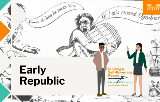 Through guided analysis, students practice the historical thinking skill of providing context, asking who, what, when, where, why, and how to better understand the cartoon’s message. They evaluate debates between Democratic-Republicans and Federalists, consider principles like separation of powers and consent of the governed, and craft a clear thesis answering the essential question: How did the Constitution influence decisions in the early Republic?