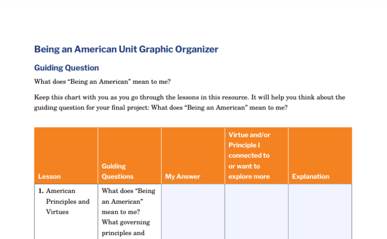 | 1. American Principles and Virtues | What does “Being an American” mean to me? What governing principles and civic virtues unite all Americans? | |||