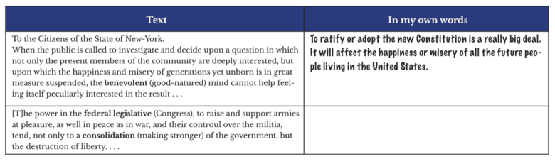 | …the power in the federal legislative (Congress), to raise and support armies at pleasure, as well in peace as in war, and their controul over the militia, tend, not only to a consolidation (making stronger) of the government, but the destruction of liberty… | |