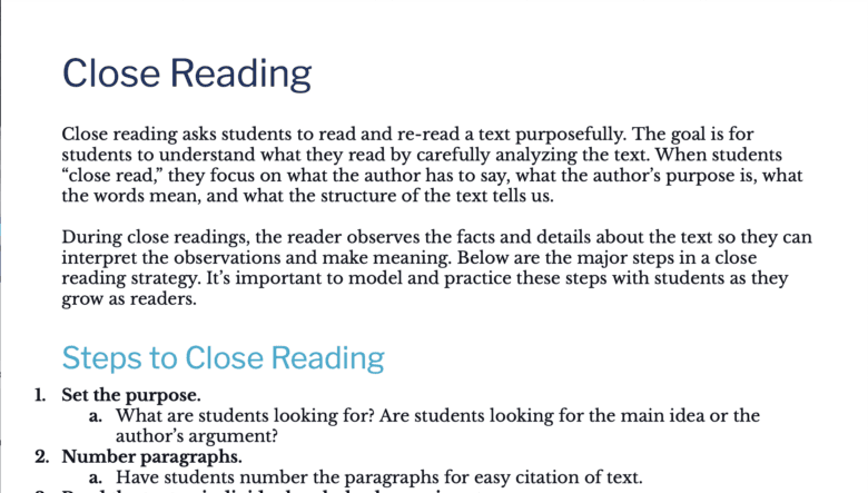 Close reading asks students to read and re-read a text purposefully. The goal is for students to understand what they read by carefully analyzing the text. When students “close read,” they focus on what the author has to say, what the author’s purpose is, what the words mean, and what the structure of the text tells us.