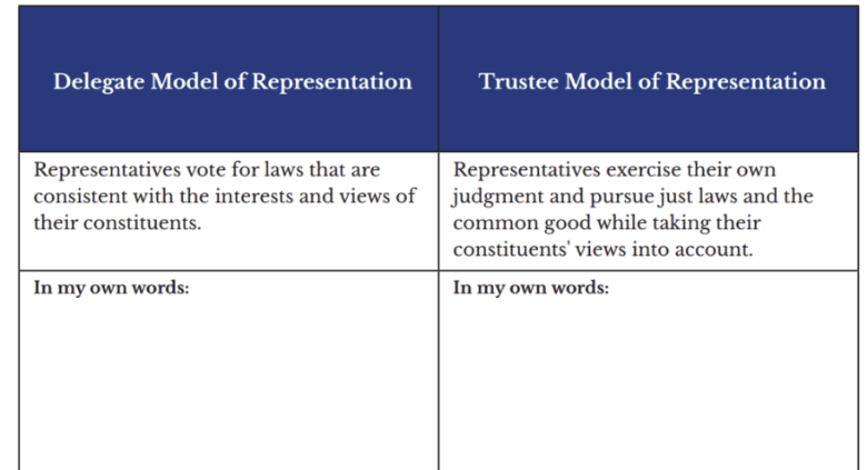 | Representatives vote for laws that are consistent with the interests and views of their constituents. | Representatives exercise their own judgment and pursue just laws and the common good while taking their constituents’ views into account. |