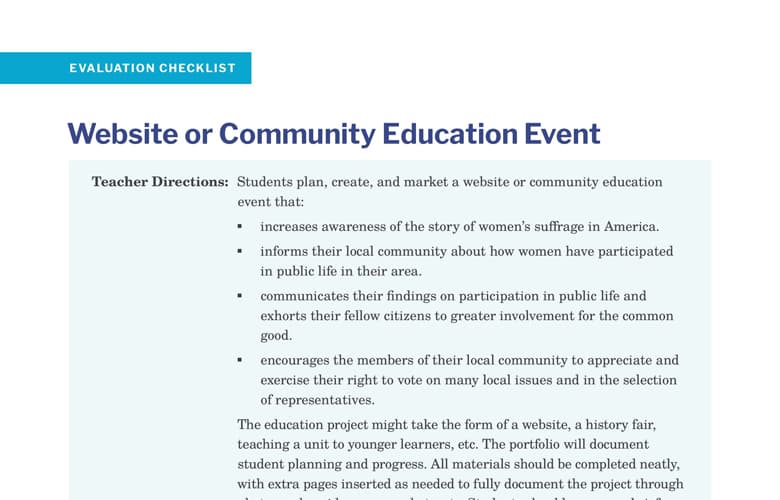 ☐ Students plan, create, and market a website or community event to educate users regarding the history of women in politics and the importance of civic virtue. (Handout D: Capstone Project Website Outline) Note: these guidelines may be adapted to help plan a history fair or other local education event.